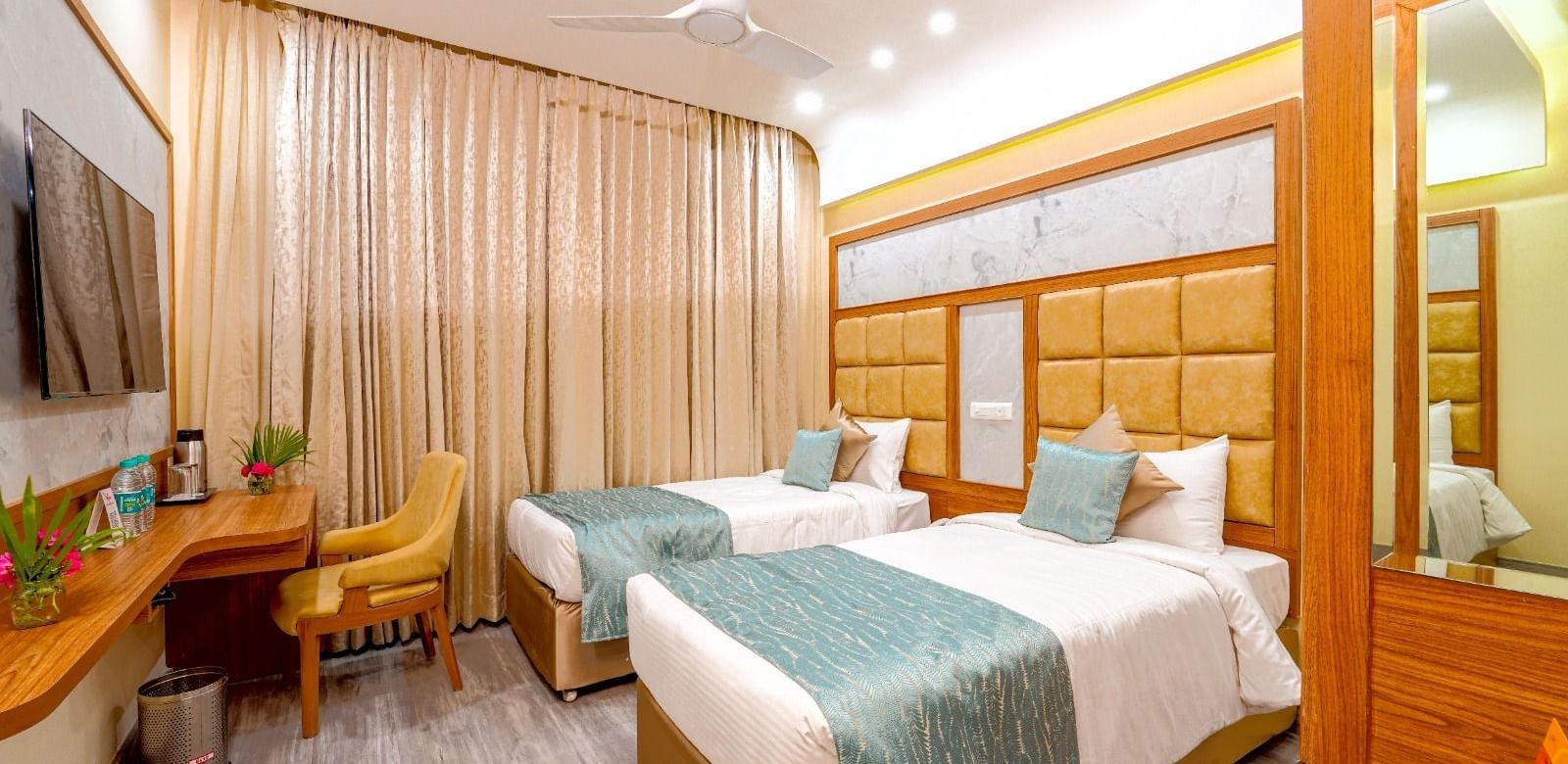 Our Deluxe Room in Hyderabad is designed to offer a comfortable stay. It features a spacious king size bed, ensuring a restful sleep. The room is tastefully decorated with sophisticated furnishings and soothing colour palettes that create a welcoming ambience. For your convenience, the room is equipped with modern amenities such as air-conditioning, high-speed Wi-Fi and a television for your entertainment. Additionally, our attentive 24-hour room service is available to cater to your needs at any time, ensuring a seamless and enjoyable stay.